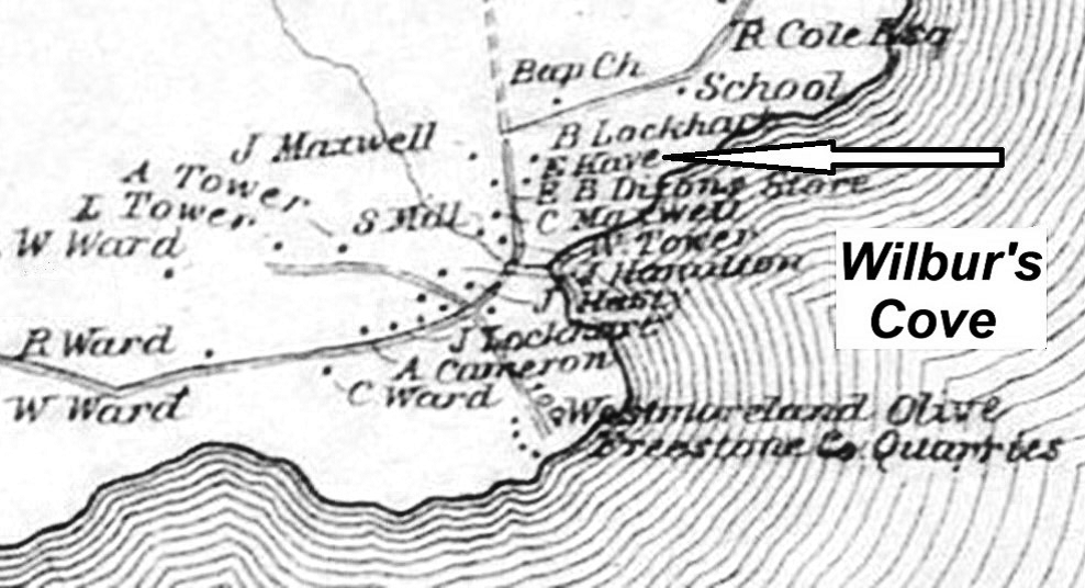 While perusing late 19th century census records for the Rockport area, I spotted a few “uncommon” names, or at least different from the more frequently encountered old peninsula names of Cole, Delesdernier, Maxwell, Lockhart, Tower and Ward. One such example was Edmund Kaye who, at age twenty-four, appeared there in the 1861 census. Also in the household at the time was his half-sister Nancy Hopkins (age 15). The location of his residence, and presumably cobbler’s workshop, is depicted on the so-called “Walling” map of 1862. The house was situated on a hill overlooking Wilbur’s Cove (Figure 2) with E.B. Dixon’s store across the road (Figure 3).