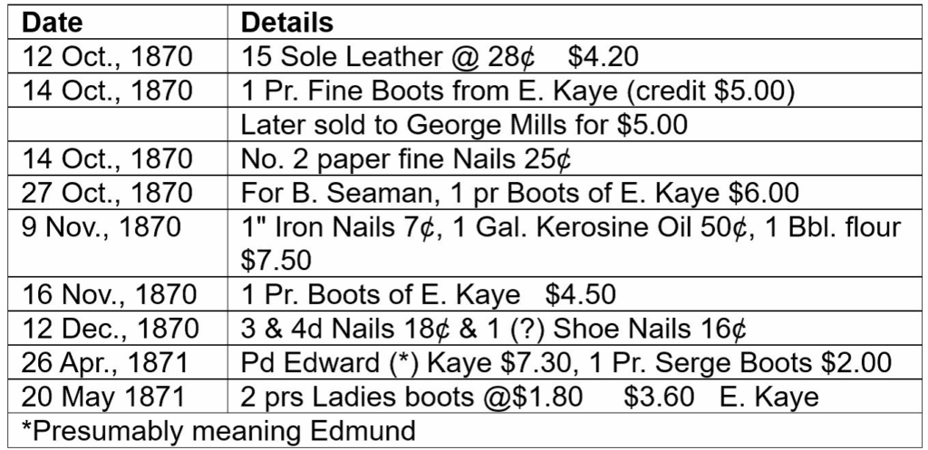 Although the information is sparse, it appears that Kaye purchased at least some of his materials needed for making foot-ware, as well as selling the finished products, through the Read, Stevenson & Co. store. Considering that the working wage for a labourer in 1870 was about $1.00 per day, a pair of boots from Edmund would have represented a week’s salary. An interesting detail revealed from the ledgers was how frequently stone workers purchased boot nails and sole leather for their own use. With working days spent walking over abrasive sandstone rocks and ledges, they presumably developed the necessary skills to repair their own boots.